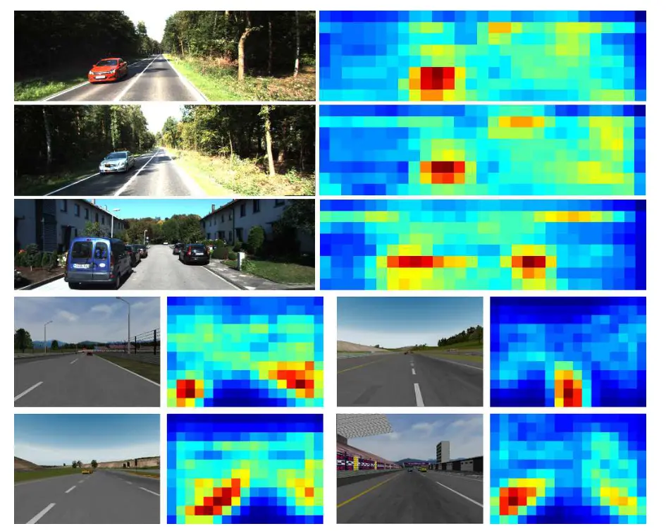 右图展示了第四个Conv的热力图。上方证明了证明了CNN对真实场景的车辆由很强的响应,也就是能关注这些区域。下图证明在TORCS场景下对车道线区域也有响应。